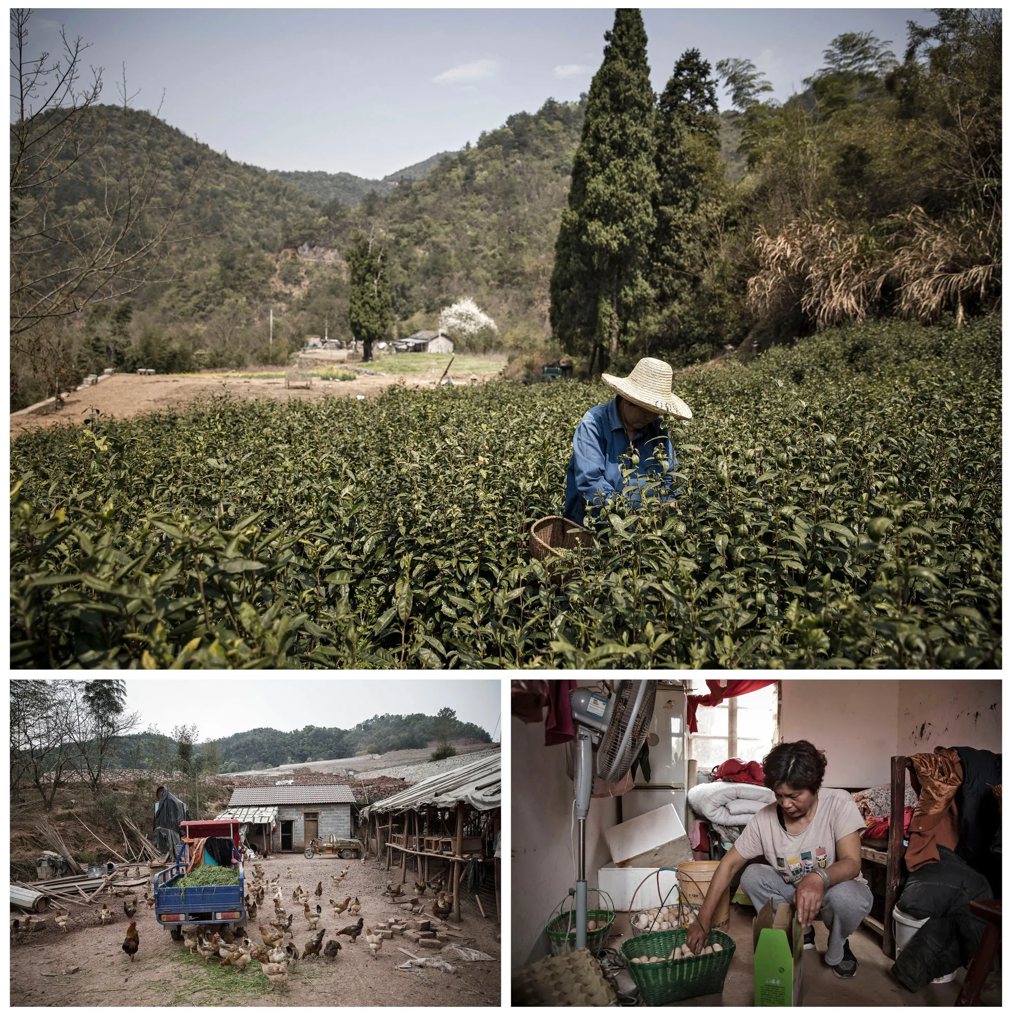 从上到下顺时针:一位农民在中国浙江省建德市附近的农场采摘茶叶;新鲜鸡蛋被包装给建德附近的皮夫生态农业有限公司;放养的鸡在李小军的皮夫农场附近自由活动。摄影师:沈启来/彭博社这对新一代农业企业家提出了挑战,他们正在租赁土地或在城市寻找小空间,以利用对无污染和多样化农产品日益增长的需求。
