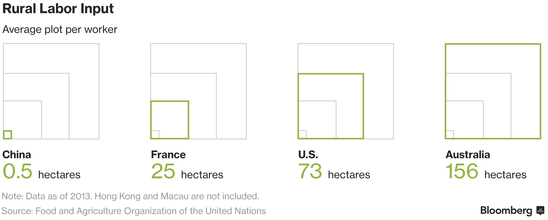 中国已采取措施试图扩大平均农场规模。农民在中国不能拥有土地,而是由地方集体分配地块,通常是几十年的租赁。去年12月,政府允许集体将土地权利捆绑在一起,向公司租出更大块的土地,这些公司支付年度租金。