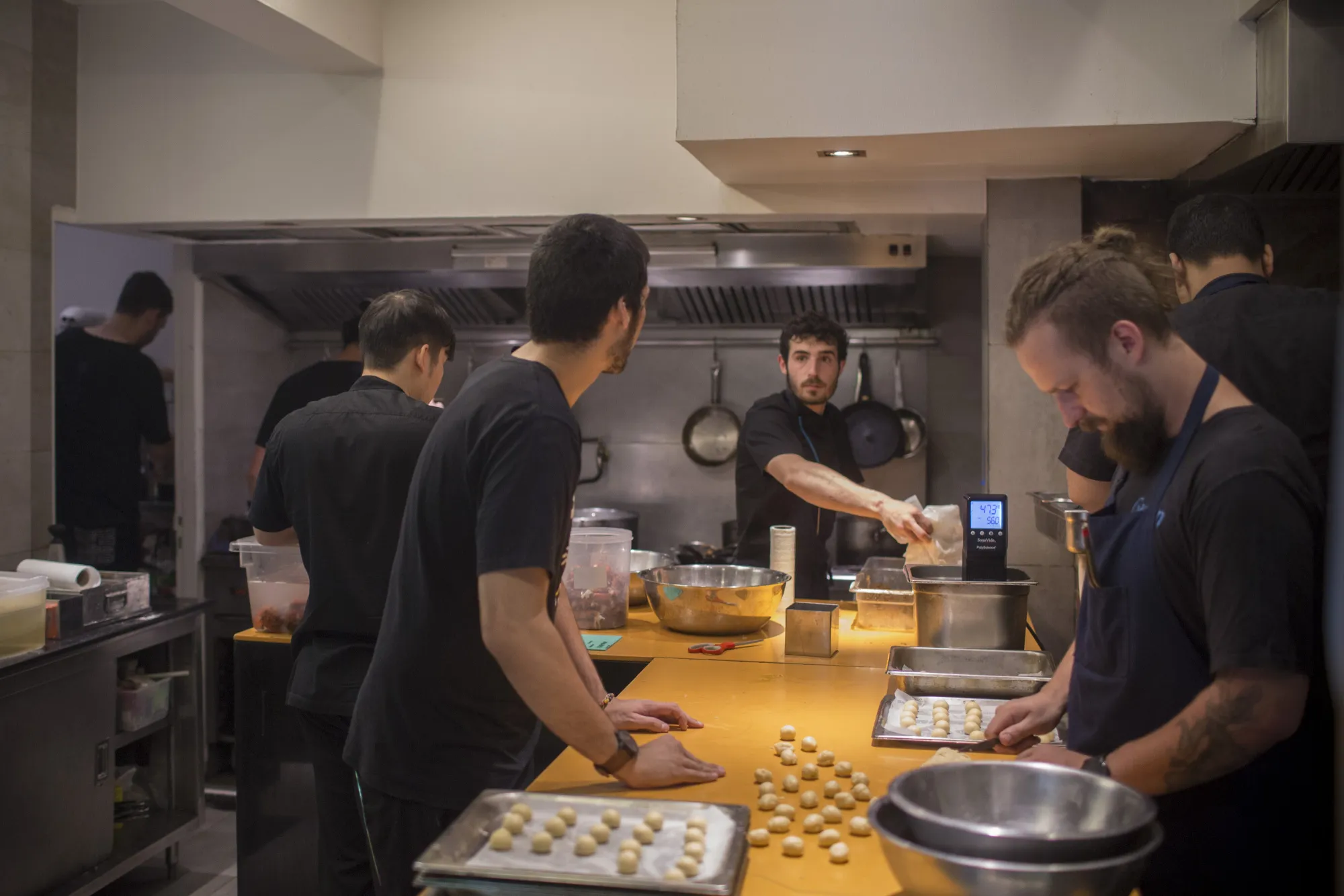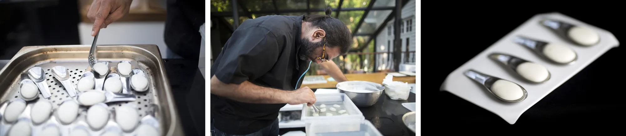 阿南德准备了一道酸奶爆炸,这是自开业以来一直在菜单上的招牌菜。摄影师:布伦特·刘因阿南德于2010年在El Bulli实习,随后在同年12月开设了以自己名字命名的餐厅。在这家西班牙餐厅,他学会了如何尝试食物。