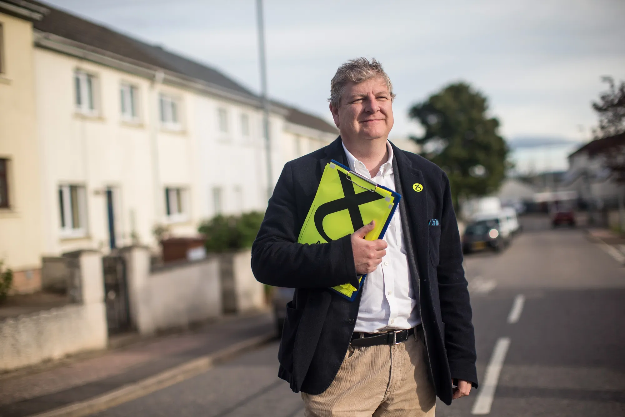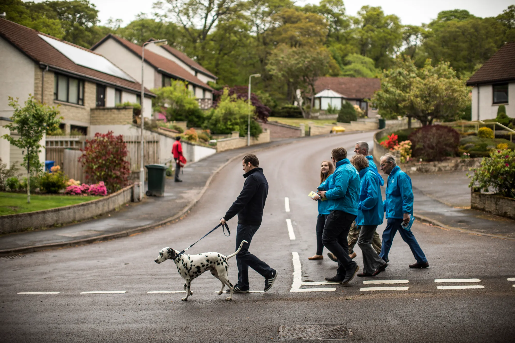 在拐角处,保守党候选人道格拉斯·罗斯,他的达尔马提亚犬和五名穿着蓝色防水外套的活动家正在敲门,试图说服选民放下他们的顾虑,选他为英国国会议员。这个地区在过去30年里一直由支持独立的苏格兰民族党掌控,因为他的政党曾因苏格兰重工业的衰退和大规模失业而受到抨击。