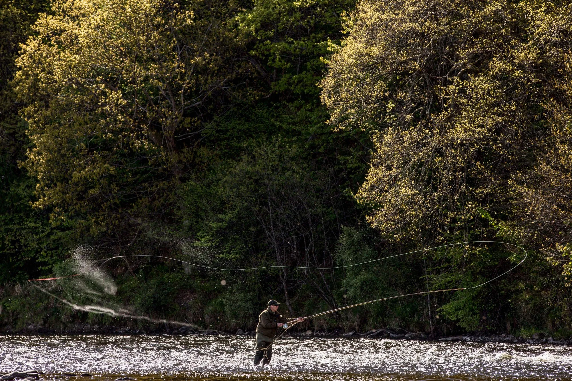 一名渔夫在斯佩河中抛竿。