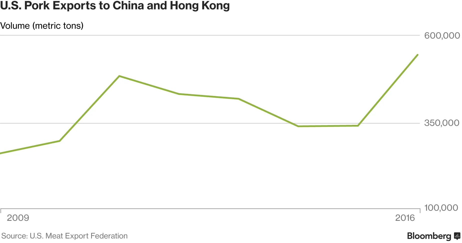 中国的人均消费为每年39.4公斤(87磅),而国内养猪场无法满足需求。根据美国肉类出口联合会的数据,去年美国对中国和香港的猪肉出口总量达到54.5万吨,比2015年增长了61%。