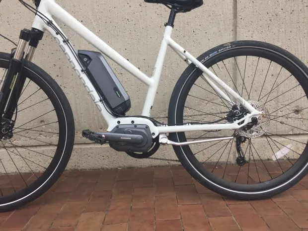 一辆配有中置踏板助力电机的Cannondale 2017 Kinneto。Andrew Small/CityLab轮毂电机的物理特性也并不理想。大多数电动自行车也使用中置驱动系统,通常由 博世、 雅马哈 和 Brose 制造,电机安装在车架上,动力从曲轴而不是齿轮轮毂分配。将一块未弹簧的重量放在自行车的后端会影响其操控性。即使是最可比的哥本哈根轮替代品,BionX销售的基于轮子的改装系统,也通过将电池嵌入自行车框架来最小化轮毂的重量。
