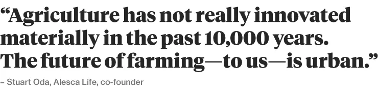 在里面,联合创始人斯图尔特·小田(Stuart Oda),曾是美国和日本美银美林的投资银行家,检查着在LED灯下生长的豌豆、芥菜、羽衣甘蓝和芝麻菜的种植箱。Alesca Life的智能手机应用程序允许种植者远程监控空气和水的条件。