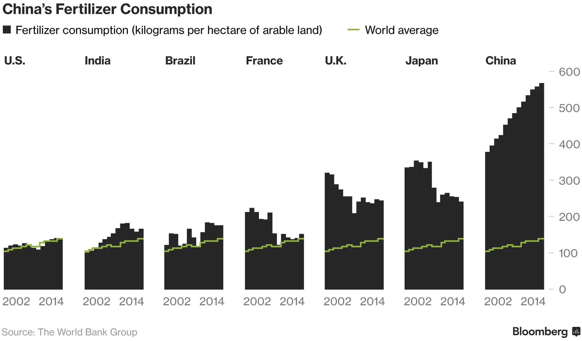 中国的农民每公顷(2.4英亩)可耕地使用的肥料是北美农民的四倍半,根据世界银行的数据。
