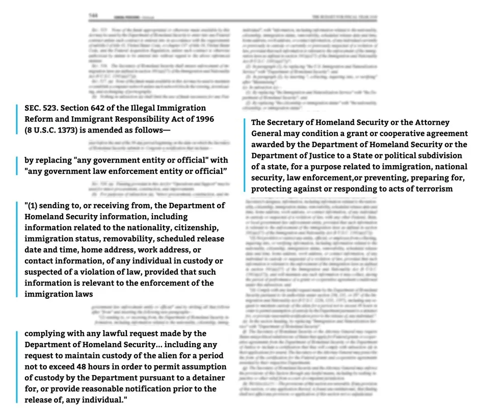 在这份1200页的文件中,藏有一项试图改变许多城市引用的法律,以作为不与联邦官员在移民执法方面合作的法律依据。