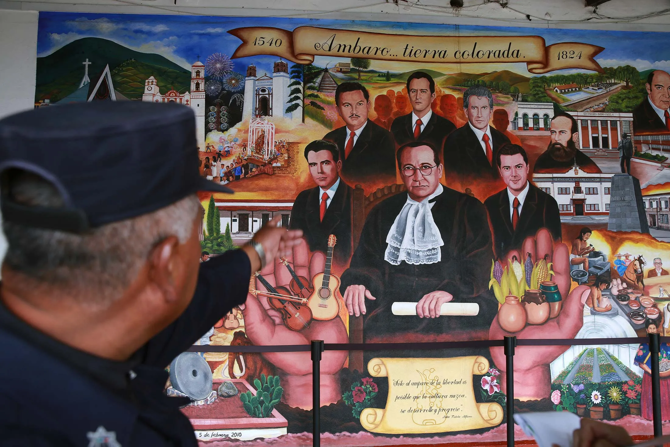 一名警察解释了市政宫内一面画着亚特拉科穆尔科人物的墙壁,这些人物曾担任州长,包括墨西哥现任总统恩里克·佩尼亚·涅托。摄影师:苏萨娜·冈萨雷斯/彭博社在城里到处都是对PRI过去辉煌的提醒。市政厅有一幅佩尼亚·涅托和其他当地州长的壁画。在几户人家外面有牌匾,宣布曾经住在那里的是哪位已故政治家。亚特拉科穆尔科有五所大学和一座粉色石头剧院,举办单口喜剧表演。