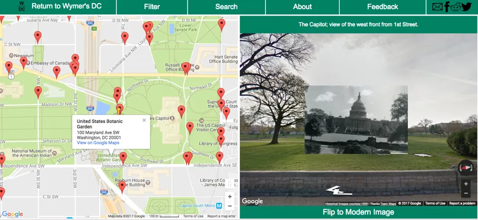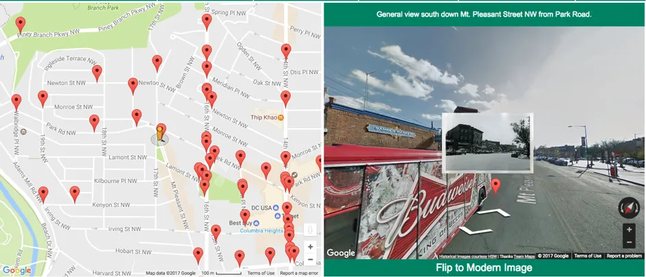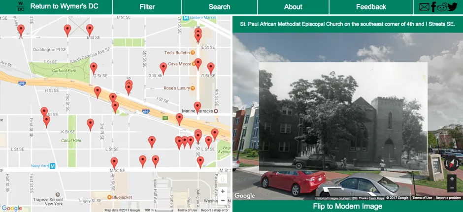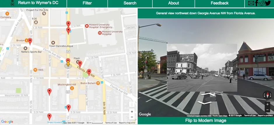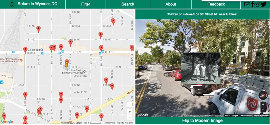 他还包括了很多关于他停下来拍摄这些照片的地方的地理细节,以便 Smith 可以手动进行地理编码。在她的地图上,用户可以选择带有大头针的区域并在其中漫游,切换 Wymer 的图像和当代的谷歌街景图像。“我真的想要那种沉浸式的体验,”Smith 说。“你知道你是通过 Wymer 的相机镜头看到1950年代的华盛顿特区。”