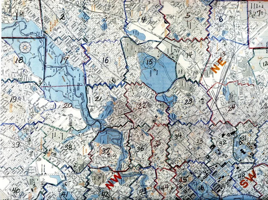 华盛顿特区被约翰·P·怀默划分为相等大小的区域。感谢华盛顿特区历史协会。约翰·P·怀默是标准局的一名统计学家,他于1930年从加利福尼亚搬到华盛顿特区。十年后,在1948年至1952年之间,他开始了一个古怪的个人项目:他将广泛记录他所称之为家的城市。