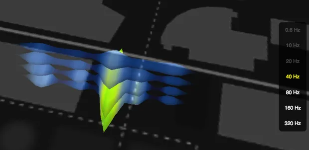 结果是一个奇特的八字形块,由霓虹色的水平带组成,这些带在校园的一个下午的十分钟内起伏不定。这些带代表了不同的振动频率,Stamen将其追溯到不同种类的移动物体;你可以在不同的时间点分开并仔细观察它们。