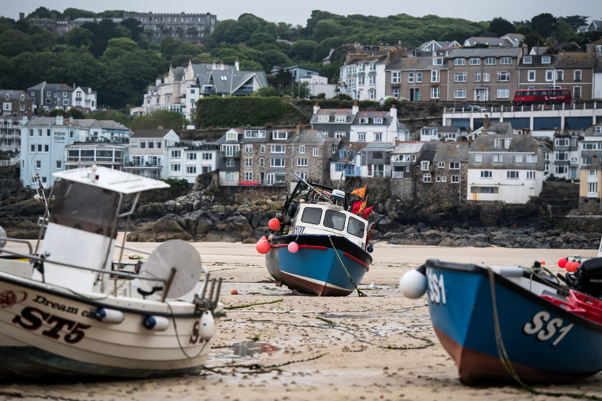在低潮时,渔船停泊在圣艾夫斯港口的海床上。