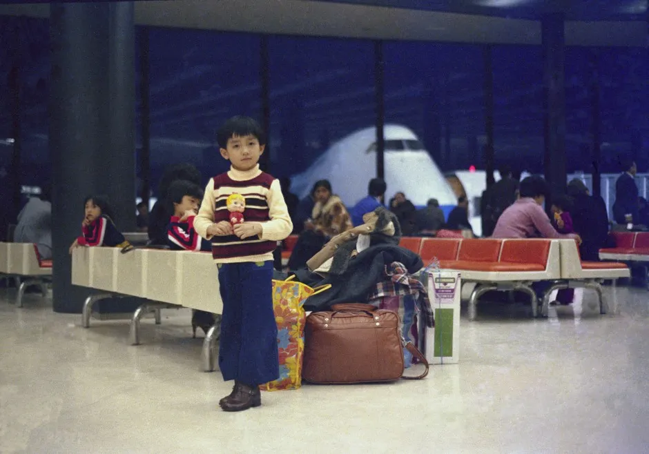 Hon Lu在成田国际机场停留时,周围是家人的行李,前往加拿大。感谢Lu-Thai家族1979年3月,Hon Lu在东京的成田国际机场站着,家人正前往加拿大。在一张照片中,这个小男孩被航站楼窗外的飞机机头所掩盖。这个画面传达了一些关于那个时代的线索:乙烯基座椅、条纹高领衫和在脚踝处喇叭形的蓝色裤子帮助将其放置在时间轴上。但图像中包含的家庭历史对于一个随意的观众来说是不可见的。