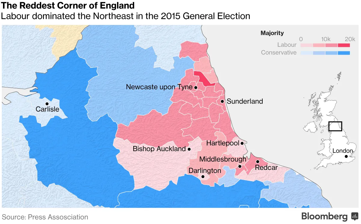 这有助于解释为什么在一些东北地区,保守党自1970年代以来就没有赢得过选举。当玛格丽特·撒切尔在1980年代执政时,这种局面更加巩固,因为她关闭了煤矿,其他重工业也在衰退。前首相托尼·布莱尔曾担任的席位,自1935年以来一直是红色的,即最后一位赢得英国选举的工党领袖。