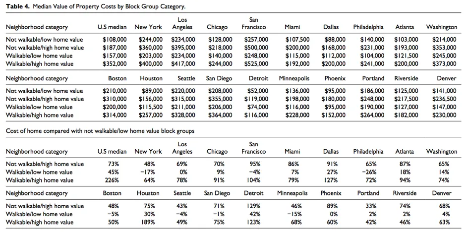 这种模式在艺术经销商中进一步放大,他们依赖富裕的赞助商在20个大城市地区开展业务。在20个大城市中,有14个城市的研究发现,艺术经销商更有可能位于价格高昂、适合步行的区域。这张来自研究的中位数房价表突显了与不同类型步行街区相关的经济权衡。