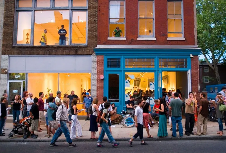 人们聚集在费城老城区附近的开放画廊街道上,参加“首个星期五”活动。鲍勃·克里斯特/访问费城在全国各地的城市中,创意区的画廊和博物馆在每个月的 第一个星期五 开放大门,进行融合艺术与城市主义的步行活动。这些漫步活动自然契合,因为艺术场所往往聚集在特定区域,相互促进——例子包括迈阿密的温伍德艺术区、纽约的中城、洛杉矶的诺霍艺术区以及亚特兰大的中城。但艺术与步行性究竟有多大的关系呢?
