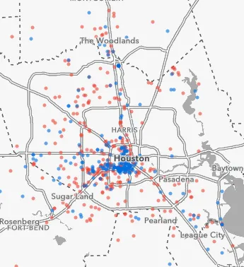 德克萨斯州休斯顿大型和小型艺术企业的地图,其中高端艺术经销商在改造街区设立的可能性是边缘街区的3.3倍。Esri 和 Infogroup这种共同模式在波士顿、芝加哥、洛杉矶、明尼阿波利斯、费城、波特兰和旧金山都是如此。然而,在丹佛、凤凰城和华盛顿特区,小型艺术企业在价格较高的城市地区设立的可能性较低。在丹佛和休斯顿,小型艺术企业在价格较高、可步行性较差的地区设立的可能性较低。只有在纽约,小型机构在偏远、价格较低的地点设立的可能性低于在更可步行的空间中设立的可能性。