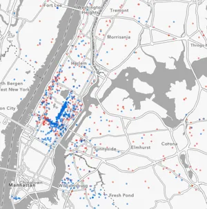 纽约市的大型艺术机构(蓝色)和小型艺术企业(红色)截至2016年2月。Esri和Infogroup该研究使用Esri在2010年关于大型艺术企业和被列为 国家艺术指数 的数据,识别这两种类型的艺术机构,以及占地少于2500平方英尺、销售额少于250,000美元且员工少于五人的小型艺术企业。作者承认,这些数据中缺少许多独立的艺术活动,例如在家庭工作室、居住工作空间、公园、社区中心或任何其他不是明确的博物馆或商店的空间中进行的工作。查看这个 地图,该地图显示了Esri和Infogroup的源数据,其中蓝点代表大型艺术企业,红点代表小型企业。需要注意的是,该研究的数据来自2010年,而Esri对此信息的地图已更新至2016年2月。