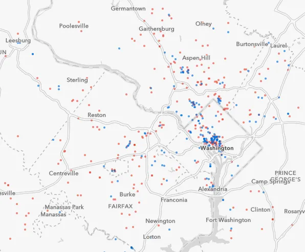 虽然华盛顿市中心有许多大型艺术画廊,但考虑到小型艺术企业在其郊区的广泛覆盖。Esri 和 Infogroup即使考虑到商业密度、社区特征和人口统计,社区位置之间的大型和小型艺术企业之间的差距依然存在,表明影响超出了基本的可负担性问题。正如研究所指出的:
