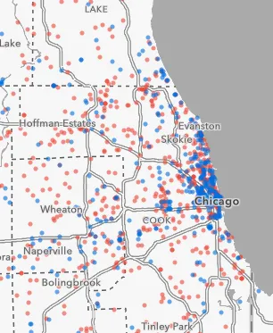 芝加哥艺术空间的地图,高端艺术经销商在改造地区的定位可能性是边缘地区的2.3倍。Esri和Infogroup该研究使用回归模型来探讨可步行性对这两种艺术机构位置的影响,控制了基于人口统计、住房、学校、密度、土地使用和其他社区特征的广泛因素。