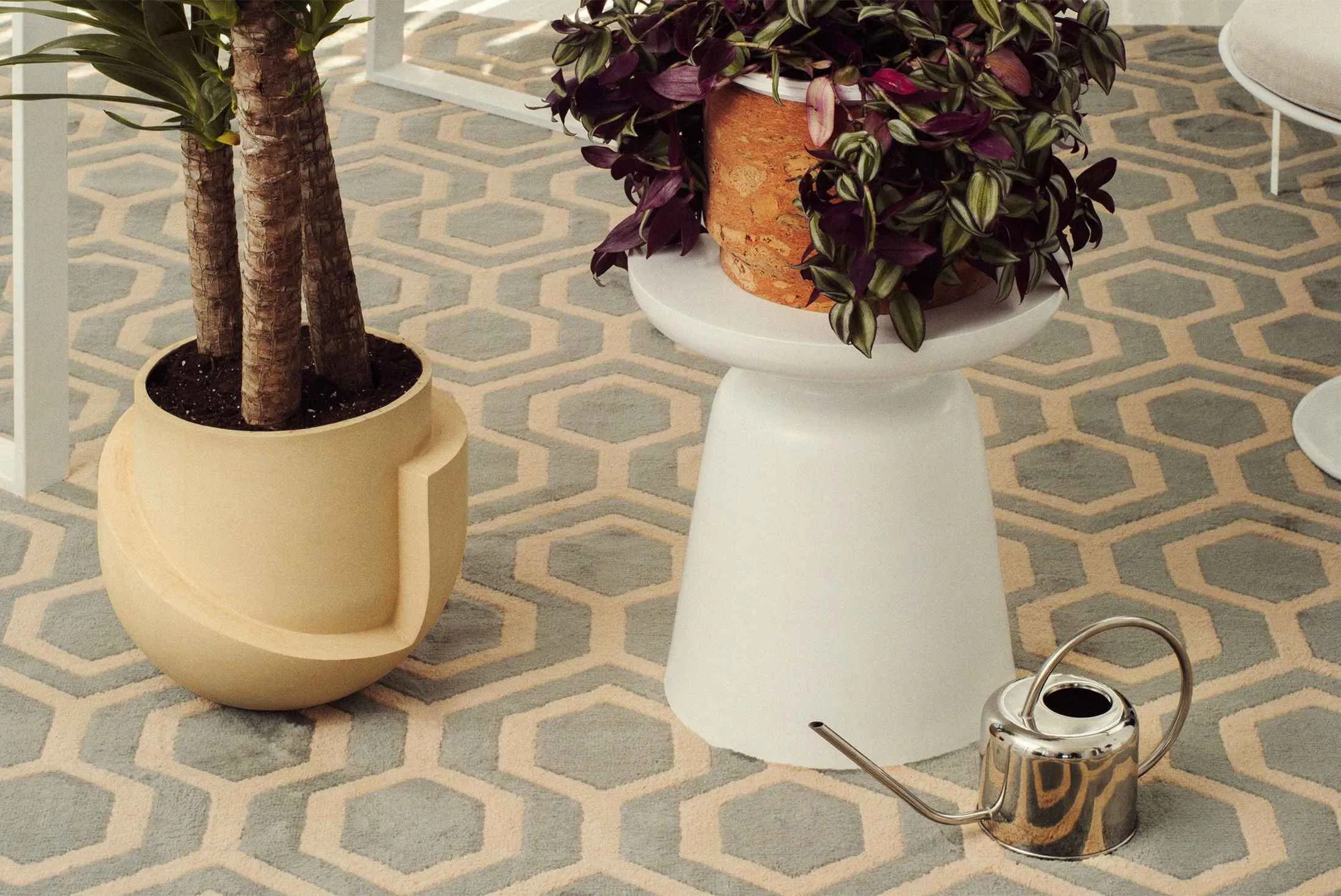 玉米葱(左)可以应对较大的温度变化。它们也耐旱,所以不要让它们泡在水中,这可能导致根腐。流浪者植物喜欢明亮的间接阳光。如果体积成为问题,不要害怕在夏天修剪。从左:Vayu 陶瓷地面花盆;现代粉色软木花盆;不锈钢浇水壶。