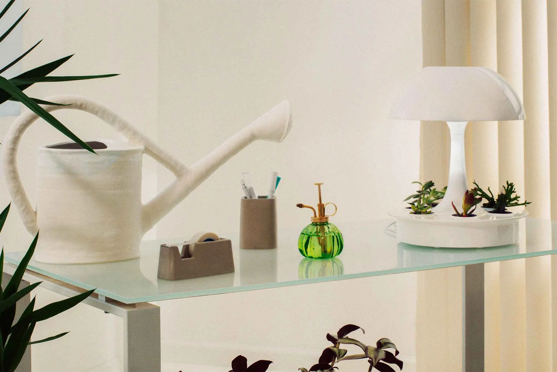 多肉植物喜欢很多光亮。给它们足够的水浸透根部,但在再次浇水之前要等土壤完全干燥。从左侧:巴萨诺陶瓷浇水壶;有色玻璃植物喷雾器;安比恩塔台灯。