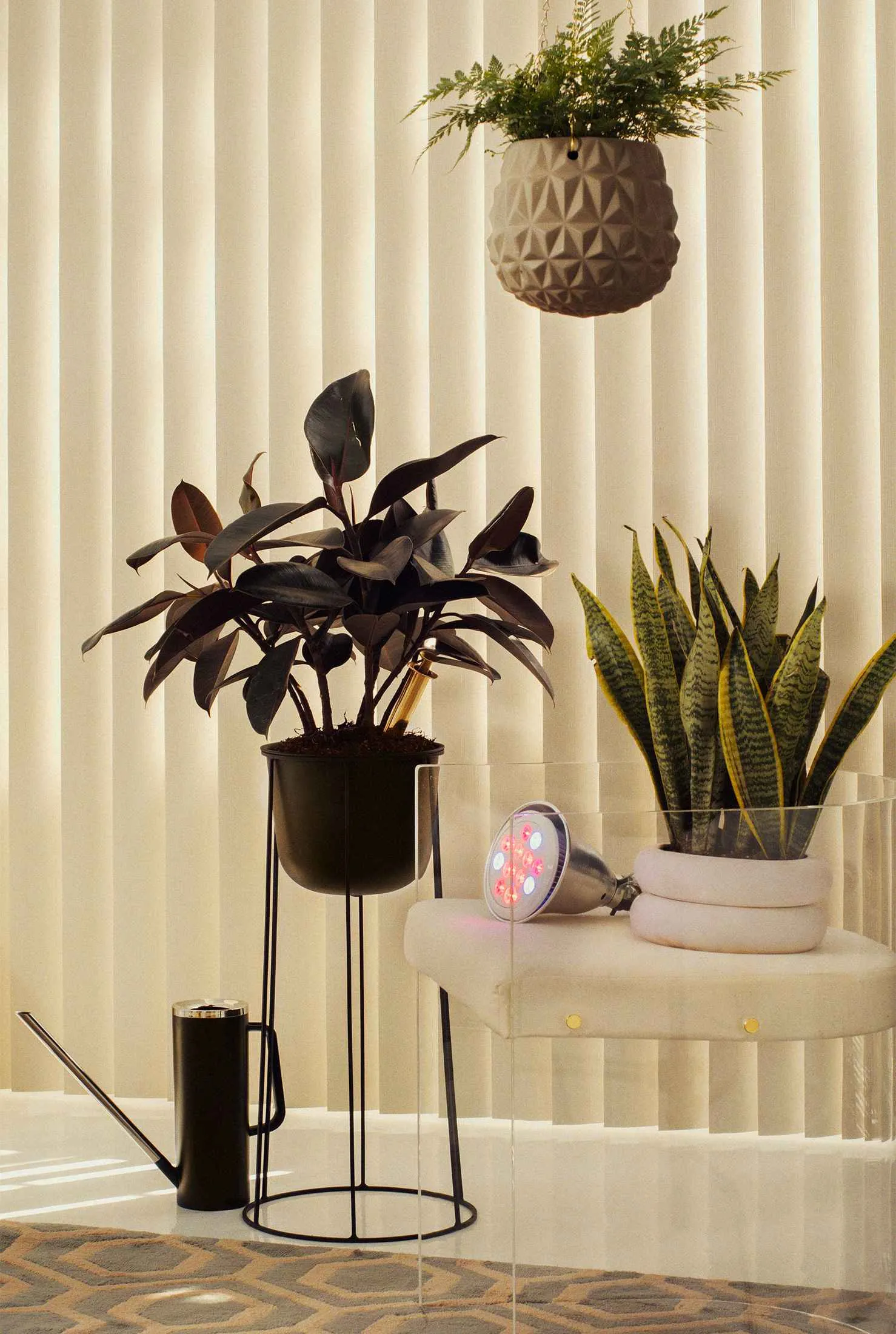 橡胶树(左)有点挑剔。卷曲的叶子表示缺水;黄色、棕色或掉落的叶子意味着你浇水过多。兔脚蕨(顶部)得名于其叶子下生长的毛茸茸的根茎。要避免直接光照,但确保它仍然在阳光充足的地方。蛇植物适合健忘的养护者。它们不需要太多水或光。从左: Limbo浇水壶;Norm Architects为Menu设计的铁丝花盆;黄铜施肥注射器;TaoTronics LED生长灯泡;Glisan灰色悬挂花盆;Chen Chen和Kai Williams设计的电动花盆(短款)。