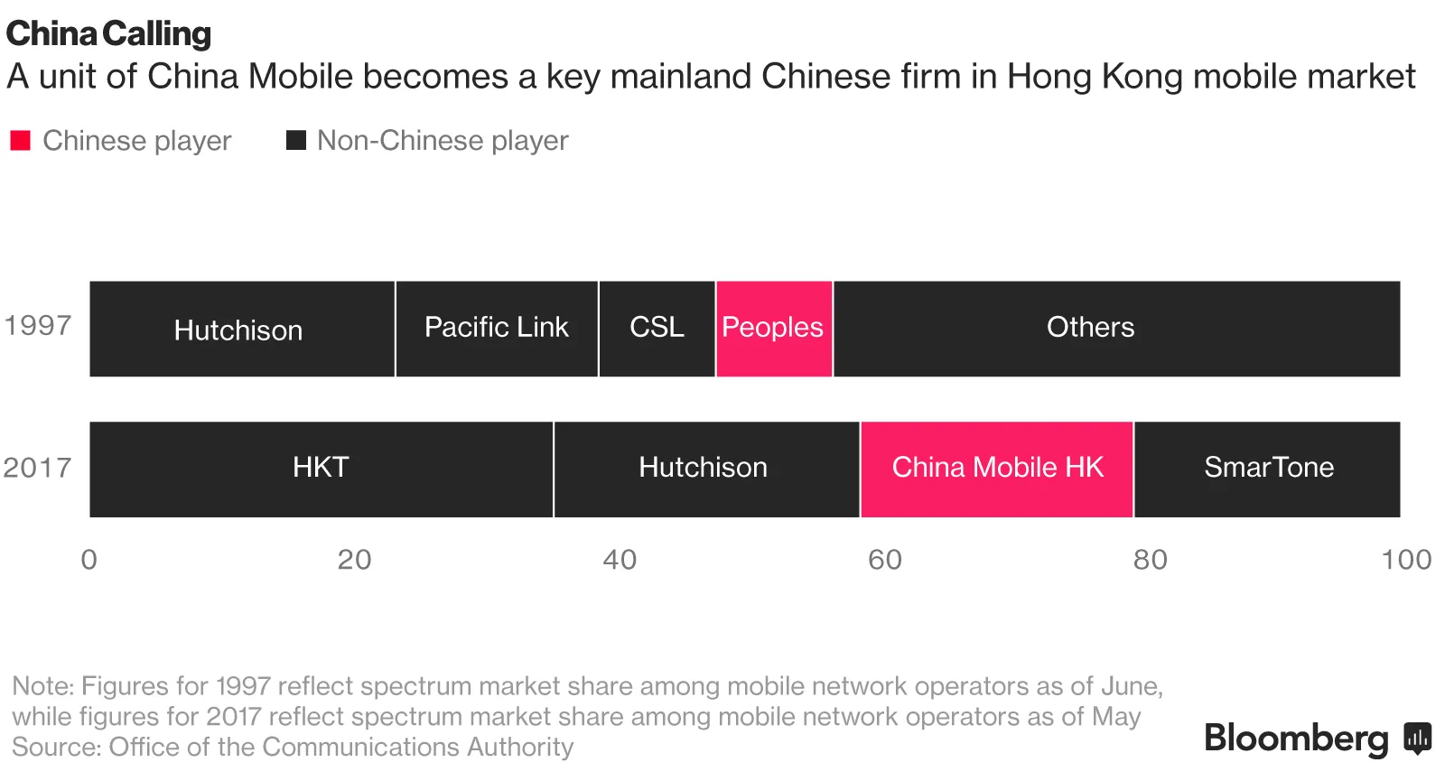经过几轮移动电话运营商的整合,中国移动有限公司于2006年首次亮相,当时市场上没有大陆运营商。中国最大的无线运营商收购了中国资源人民电话有限公司,该公司当时由一家大陆企业集团控制。中国移动现在拥有香港商业电话频谱的五分之一。它与本地大亨拥有的公司共享这一空间,包括新鸿基地产的郭氏家族、长江和记实业有限公司的李嘉诚及其儿子李泽楷。