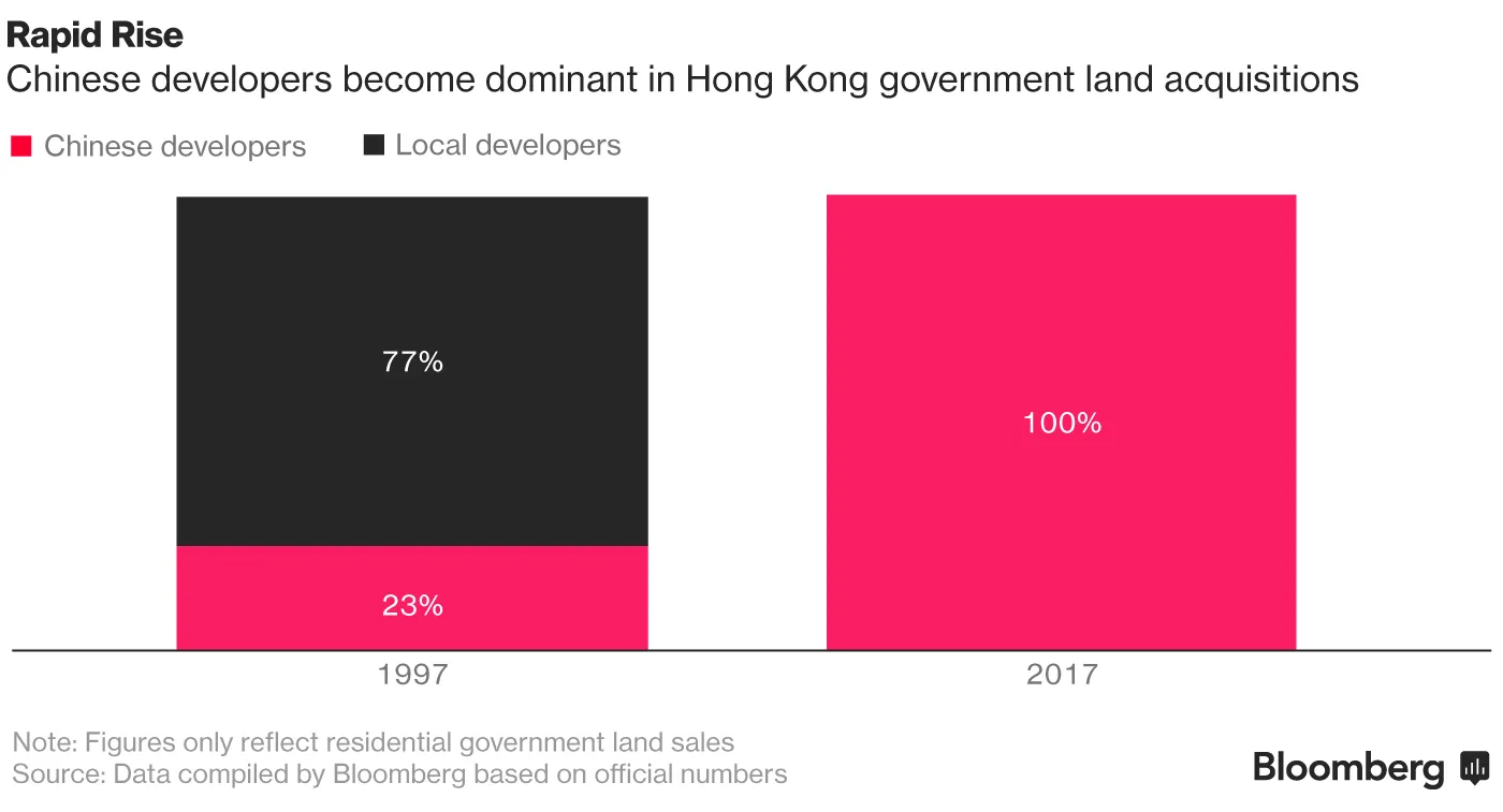 大陆开发商开始超越曾经主导政府土地购买以开发住宅的香港地产亿万富翁,时间是2011年。今年,中国买家抢购了所有住宅用地,延续了他们去年的势头,当时他们几乎将一半的销售收入收入囊中。