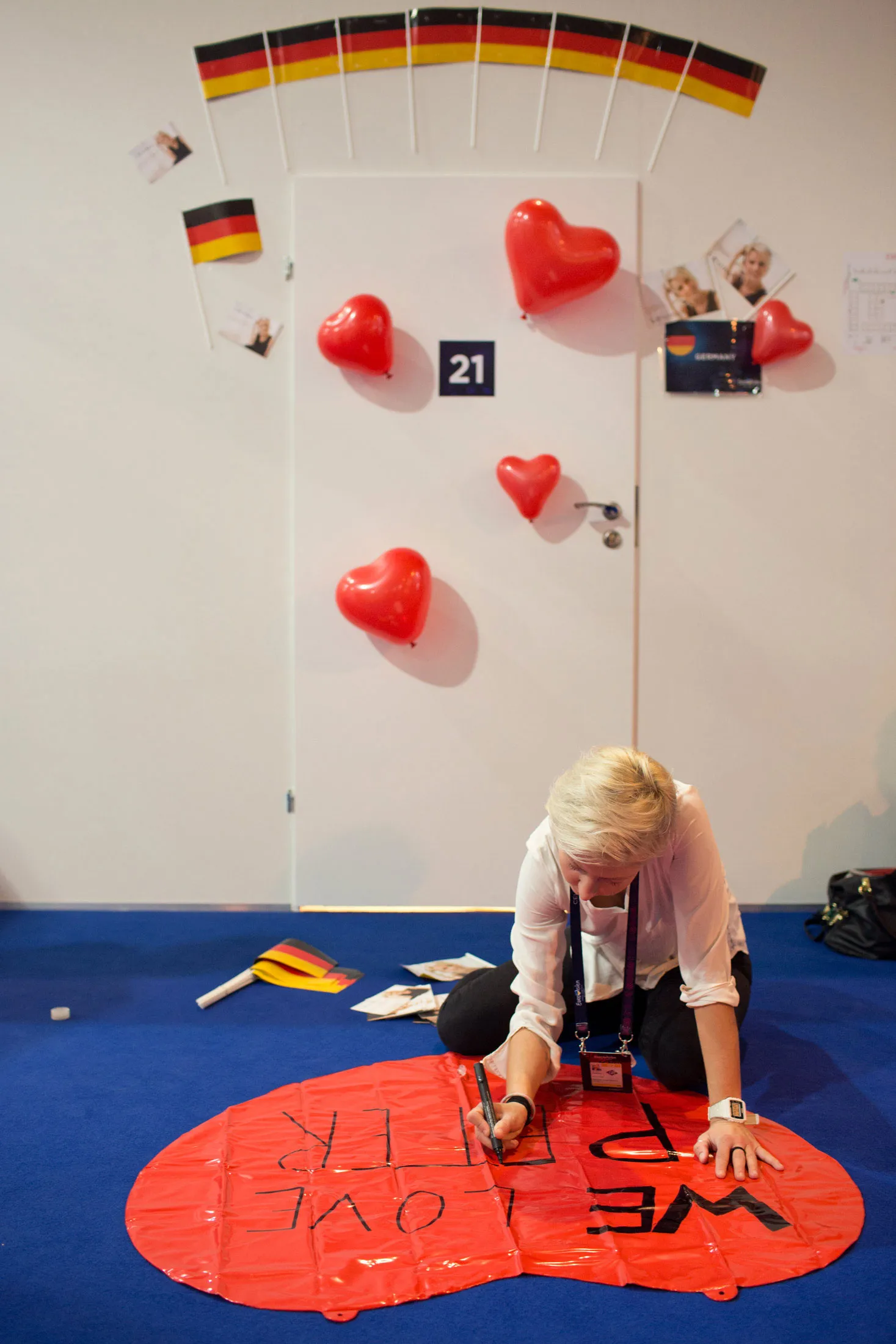 德国代表团的一名成员在国家更衣室外完成一个标志。摄影师:索菲·格林为《彭博商业周刊》之后,在2016年夏天,俄罗斯和欧洲报纸开始传播关于基辅主办计划混乱的报道,以至于庆祝活动不得不迁移到莫斯科。其他俄罗斯媒体报道称,基辅当局在比赛前射杀流浪狗,欧洲歌唱大赛导致乌克兰人的能源账单上涨15%,以及同性恋者在城市街道上被谋杀。所有这些故事都是假的。