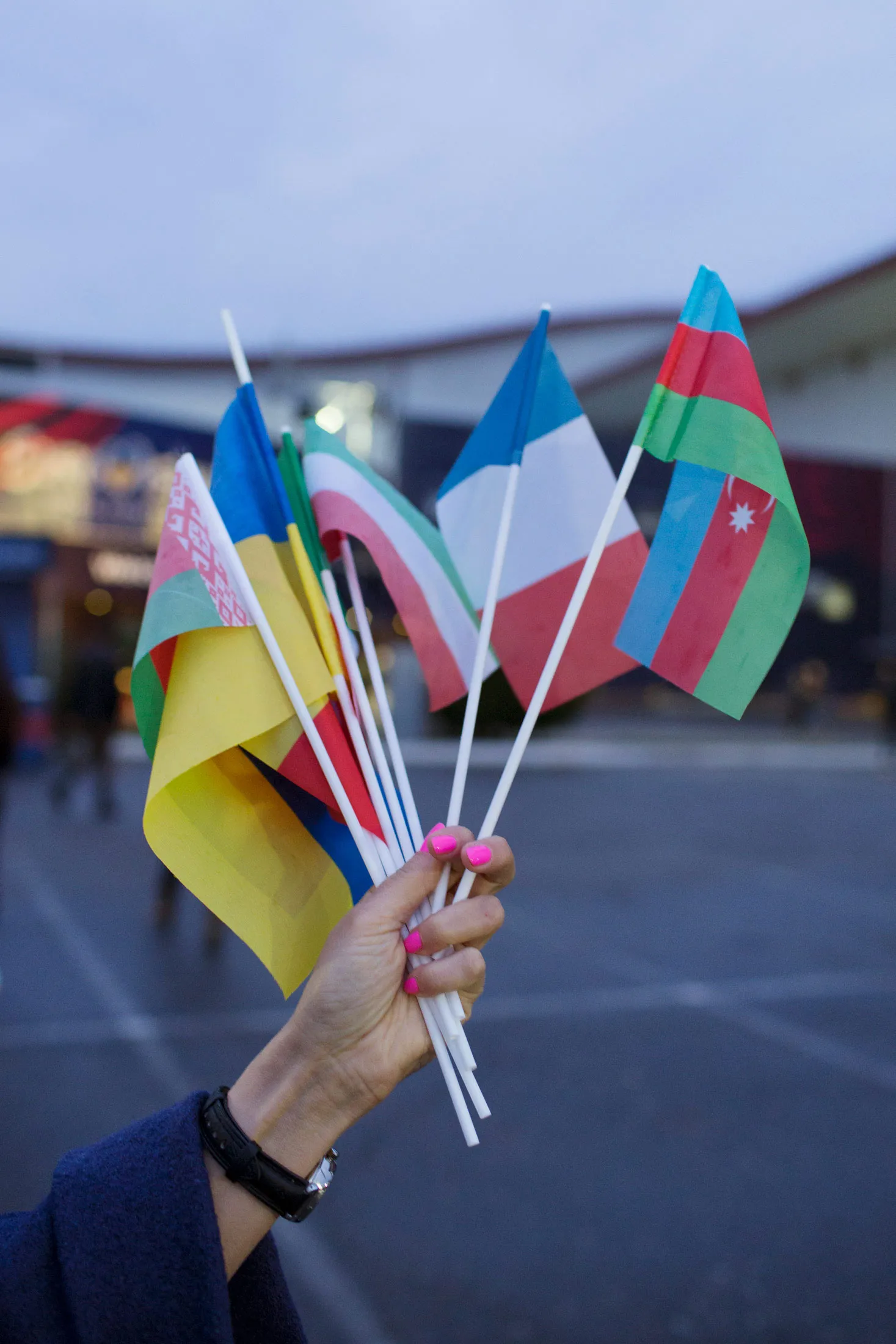 一位观众手持代表一些参赛国家的旗帜。摄影师:Sophie Green,彭博商业周刊Galich的更衣室位于比利时和德国之间,他正遭受欧洲歌唱大赛的疲惫。他的妻子在两周前生下了孩子,而由于采访和排练的轰炸,他已经六天没见到他们的宝宝。国际决赛比乌克兰的选拔活动更为光鲜,而O.Torvald担心反响,决定不穿他们的自杀炸弹道具。尽管他们作为东道主的代表,允许他们跳过半决赛,直接进入决赛阵容,但Ladbrokes给这个乐队的获胜赔率是125比1。