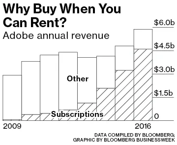 照片插图由731提供当Adobe系统公司在不到五年前开始从产品销售模式转向基于云的订阅模式时,这一举动看起来很冒险。怀疑者认为这会侵蚀公司昂贵设计、摄影和视频软件的丰厚利润率。当时,其热门的Creative Suite套餐的价格,从1300美元起,最高可达2600美元,具体取决于版本。同时,一些客户公开反对永久租用基于云的版本。大约50,000人签署了一份Change.org请愿书,要求公司放弃这一计划。2013年,收入缩水8%,次年几乎持平。
