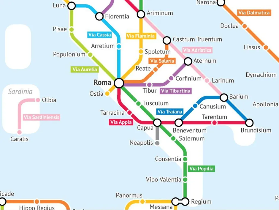 那么它是如何运作的呢?好吧,如果皇帝奥勒良想要从罗马派遣军队到前线参加 伊马战役——这是第三世纪与女王泽诺比亚领导的东部叛军的冲突——他们必须先上黄色的弗拉米尼亚大道,经过两站后转乘绿色的苏基纳里亚大道,在卡尔努图姆、希尔米乌姆、辛吉杜努姆再进行额外的换乘,然后在橙色/蓝色/紫色线路之间进行更多的换乘,直到抵达现代叙利亚的帕尔米拉站。