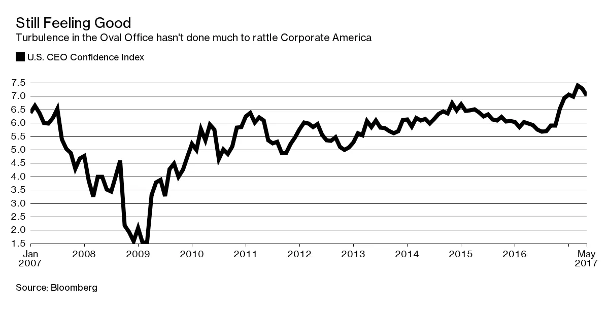 我们正进入一个通常会放缓的季节。今年不同的是,我们可能正处于至少两项重大合并的边缘,这将可能引发其各自行业中的其他交易。一项是斯普林特公司和T-Mobile美国公司,另一项是卡夫亨氏公司及其支持者3G资本和伯克希尔哈撒韦公司在2月份对联合利华的失败尝试之后正在筹备的交易。此外,首席执行官的信心仍然很高: