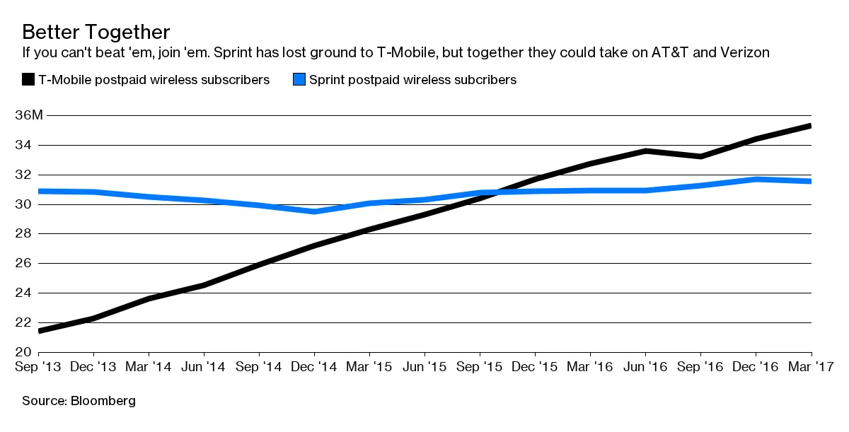 无线运营商Sprint和T-Mobile的市值合计约为900亿美元,已经在早期阶段讨论合并,并考虑进行全股票交易,根据本周的彭博新闻报道。他们达成协议的可能性很大,或者其中一方被其他方收购。控制Sprint的日本公司软银集团已成为一个积极的卖家。2013年,它以166亿美元收购了控股权,并向Sprint的业务注入了另外50亿美元,而Sprint当时仍在为几年前不幸的Nextel合并而苦苦挣扎。自从软银接管以来,Sprint持续面临现金问题,迫使其将频谱和其他资产作为抵押品。T-Mobile的用户数量也超过了Sprint。
