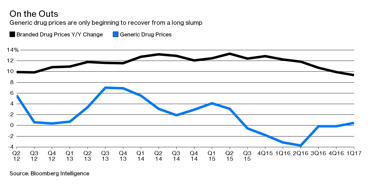 彭博情报分析发现,仿制药价格在连续六个季度中同比下降,直到第一季度增长回归。在那次下滑之前,价格已经上涨超过两年,尽管增长速度在放缓: