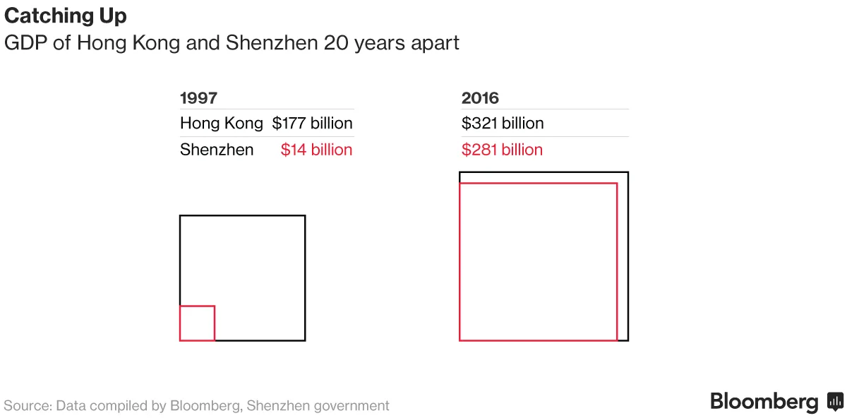 第一个是香港,在19世纪中叶被设为自由港后迅速崛起,到20年前回归中国时,成为自由市场资本主义的典范。在过去的二十年里,它目睹了深圳的耀眼崛起,深圳就在深川河对面。