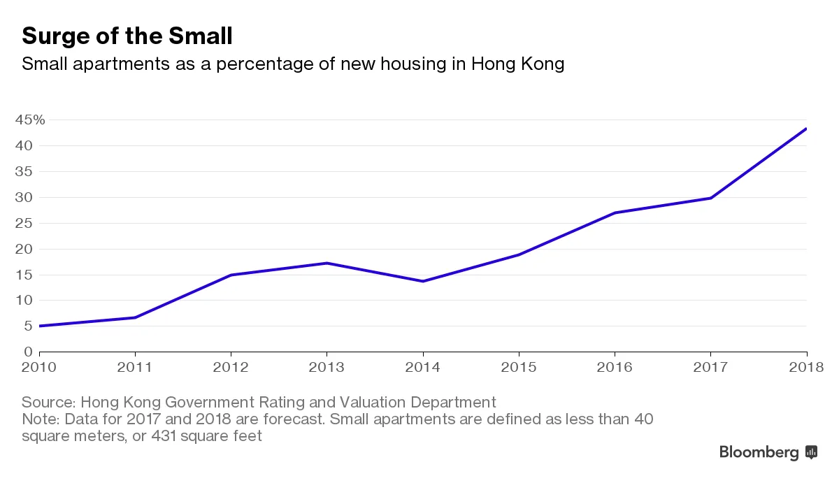 根据政府数据显示,2010年小型公寓仅占新住房的5%,而到去年这一比例跃升至27%,预计明年将增加到43%。然而,它们的价格在2010年至2016年间上涨了99%——涨幅是大多数香港人口无法负担的大型住宅的两倍多。