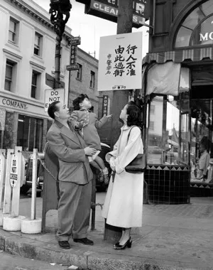 1953年旧金山的华埠美联社然后还有故事的另一部分:住房歧视和亚裔美国人被排除在郊区之外。加利福尼亚州的许多第一批排外分区法实际上是针对华埠的亚裔美国人。旧金山拥有最早和执行最严格的种族分区法之一。这些法律是由文化污染的观念推动的。亚裔美国人被视为最终的外来者,他们的存在在某种程度上会影响美国经验的纯洁性。