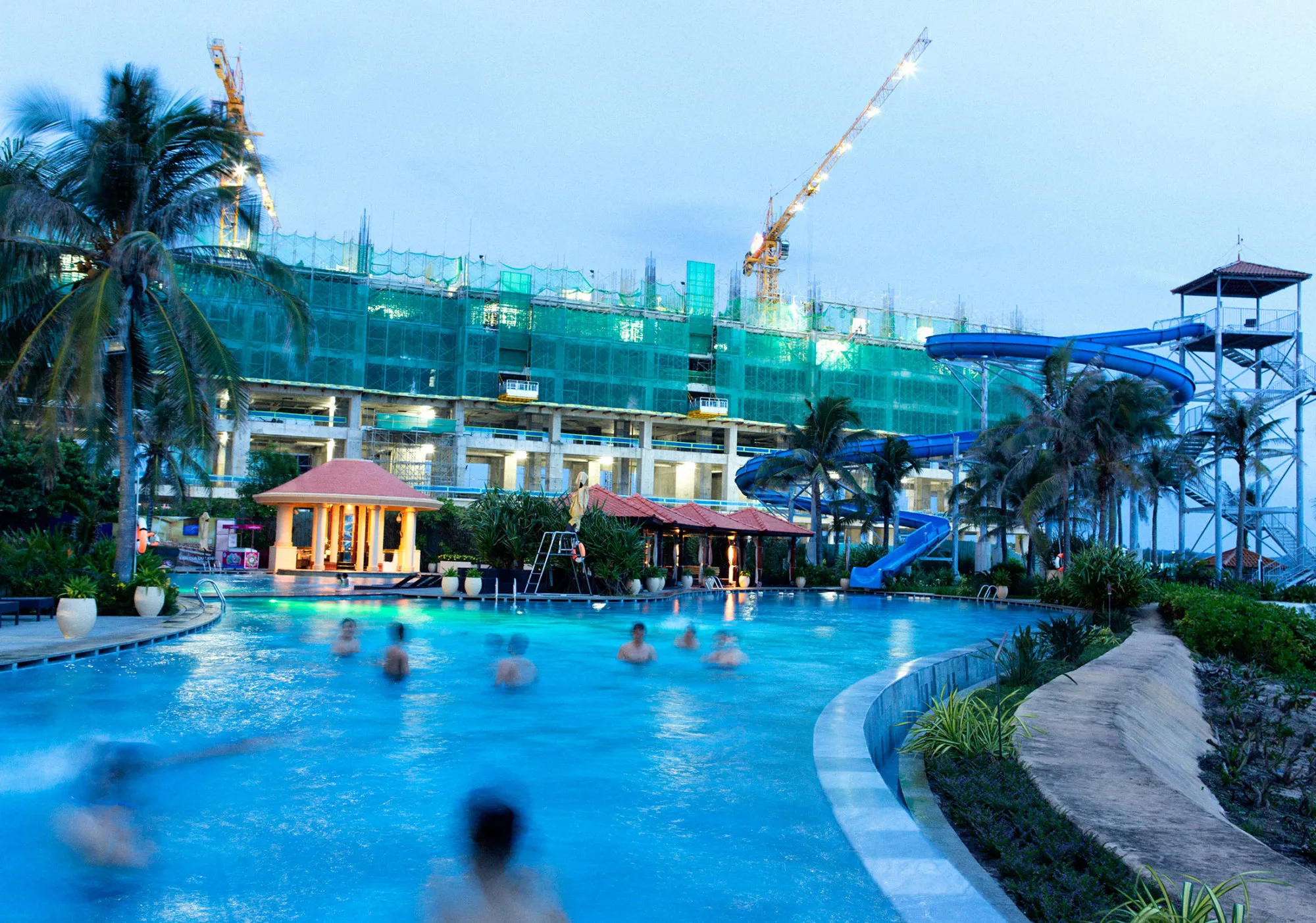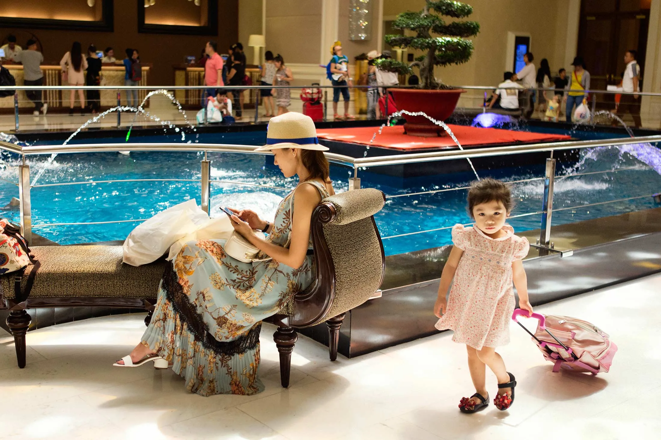霍特拉姆的第一阶段横跨海滩,由一座淡黄色的22层酒店塔楼和低层赌场组成——一种西班牙风格的陶土与伪巴洛克山花的尴尬碰撞。和拉斯维加斯一样,这里没有阳台或完全打开的窗户。酒店靠近一个平淡无奇的喷泉,梦之湖,半心半意地向贝拉吉奥致敬。(会说英语的员工嘲笑说“缺乏梦想”更贴切。)在一个从星期天到星期二的访问期间——这不是任何酒店的高峰时段——这个综合体安静且客流稀少。可见的客人往往是穿着人字拖和运动服的中产阶级越南家庭,以及年轻的越南情侣。