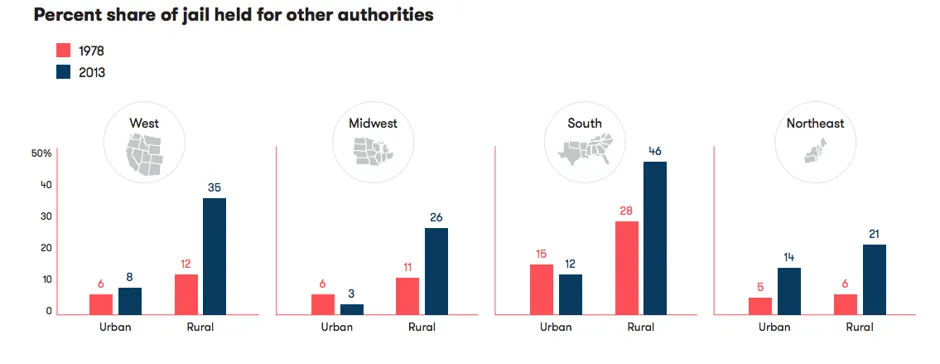这就是为什么在美国农村,因其他机构而入狱的人数急剧上升——根据维拉研究所,自1970年代以来增长了惊人的888%。其次是中型城市,增长了486%。以下是按地区的细分:
