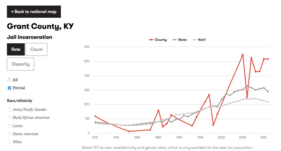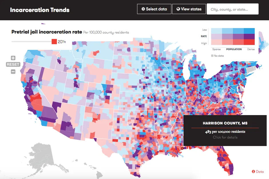 在他们的网站上,维拉研究所有一个互动地图,显示每个县的审前监禁率。左上角是一个时间轴,让用户可以看到随时间变化的情况。