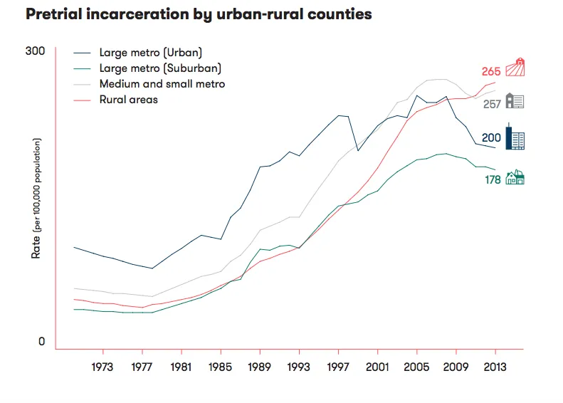 维拉研究所的报告,由雅各布·康-布朗和拉姆·苏布拉马尼安撰写,证实了这些原因,并分析了它们在美国不同地区的表现。报告发现,预审拘留率的上升在农村县尤其显著,从1970年到2013年上升了436%。这意味着每10万居民中就有200人被困在农村监狱,处于刑事司法的某种状态中。要么他们无法 支付保释金,要么无法获得快速的法庭听证,或者(在密苏里州和路易斯安那州等地) 无法获得公共辩护人来为他们辩护。多年来,这一农村预审监禁率已高于城市和郊区: