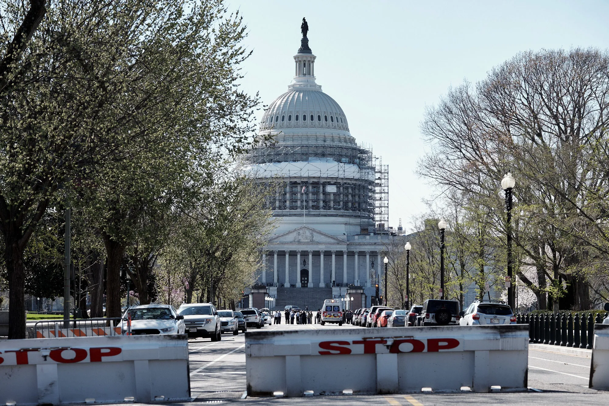 美国国会警察在2016年3月28日星期一,在华盛顿游客中心发生枪击事件后封锁国会大厦。根据国会官员的说法,一名枪手已被拘留,白宫也短暂封锁。