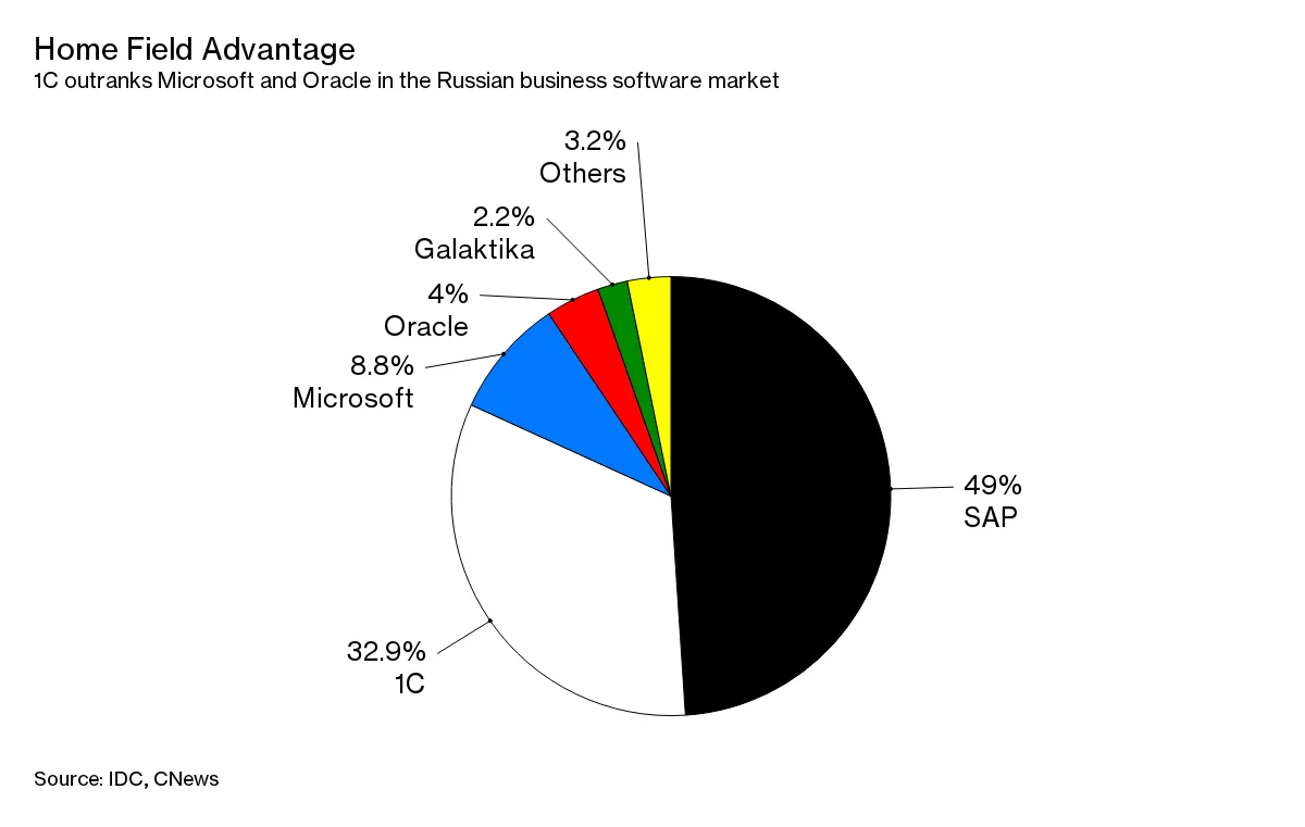 根据研究机构IDC的数据,该公司的年收入去年增长了6%,达到370亿卢布(6.5亿美元),使1C在俄罗斯企业应用软件市场占据三分之一,仅次于SAP的49%。按安装量计算,1C是领导者,拥有约500万用户——大多数来自小型和中型企业,这些企业并未被IDC完全追踪。根据与SAP和其他三家上市公司的比较,彭博亿万富翁指数将该公司的估值定为23亿美元,这意味着拥有超过一半1C股份的努拉利耶夫的净资产为12亿美元。