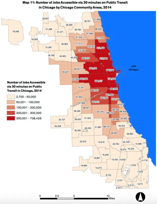 此外,城市南部地区的工作岗位公共交通服务不佳,使得即使是相对较近的工作也很难到达。威尔逊和他的共同作者特蕾莎·L·科尔多瓦确定,环线及其周边地区拥有最多的工作岗位,工人可以通过公交车或“L”线火车通勤,而随着向南移动,类似可达工作的数量则减少。“当来自远南边的年轻人看到环线的工作招聘信息时,他们甚至不会填写申请,”威尔逊说。“到达那里所需的时间和费用是不可承受的。”