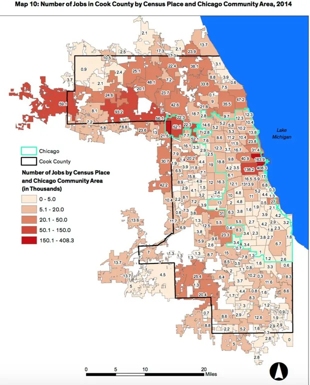 是什么导致如此高比例的城市失业青年?报告的作者发现,工作机会主要集中在芝加哥的中央金融区——被称为“环路”——以及其北部和西部的富裕郊区。相比之下,南侧和南部郊区以其集中贫困和种族隔离而闻名,机会较少。例如,城市北部的社区有 10,362 到 31,427 个工作,而南侧海德公园社区以下的地区没有超过 6,692 个工作。南部的 25 个社区区域中有 13 个每个地区的工作少于 3,000 个**。**