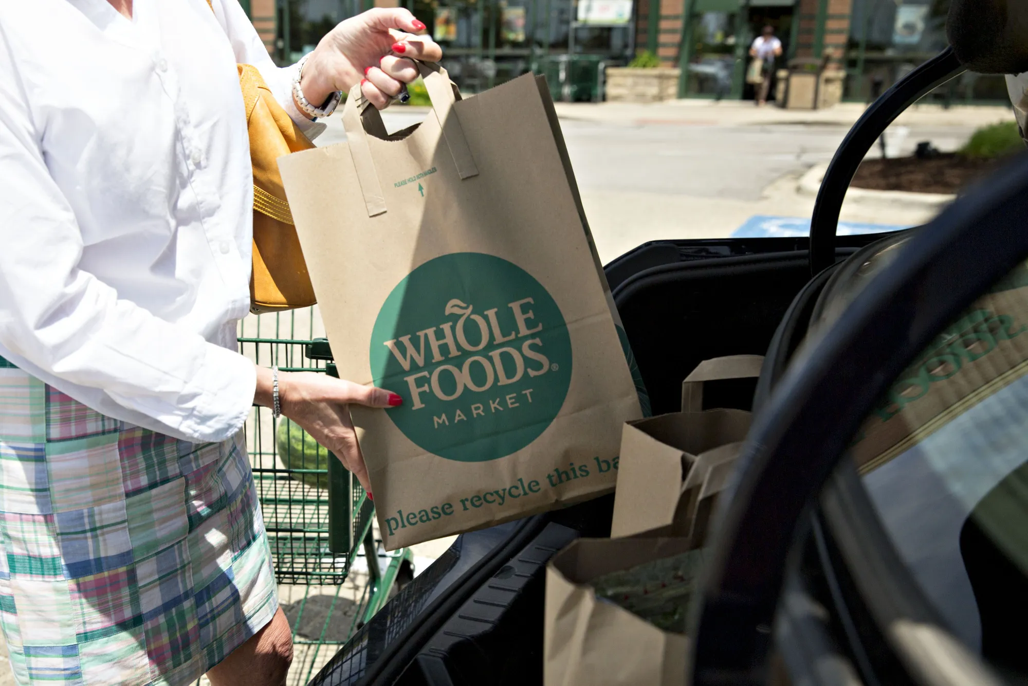 一位顾客在美国伊利诺伊州纳珀维尔的全食超市外将购物袋装入车辆,时间是2017年6月16日,星期五。亚马逊公司将以137亿美元收购全食超市,这是一笔震撼的交易,使这家电子商务巨头进入数百家实体店,并实现了销售更多杂货的长期目标。