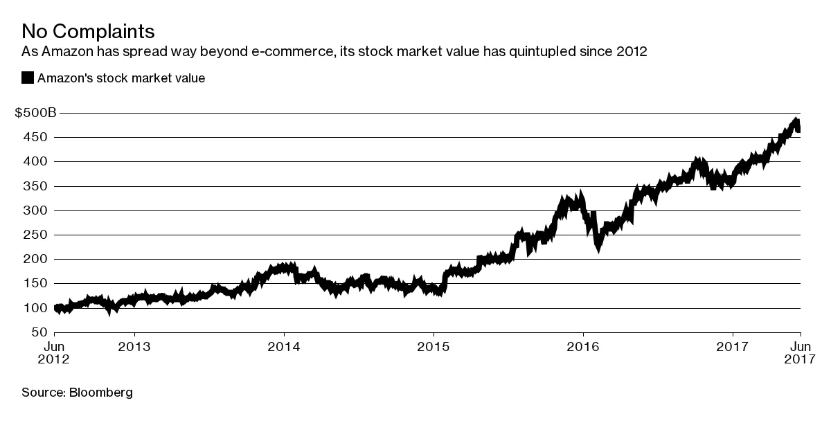 而这种对亚马逊扩张的乐观反应并不是一次性的。在过去五年中,随着亚马逊进入更多商业领域——并且其销售和现金流不断增长——公司的市值已经增长了五倍。