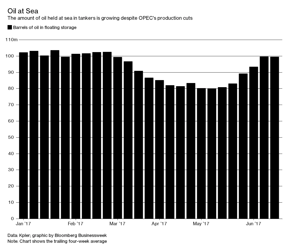 数据:Kpler;图表由彭博商业周刊提供就在石油市场看起来可能会好转时,警告信号出现了。首先,美国石油公司积累了一个创纪录的大量井被钻探并等待完成,释放出他们的原油洪流。此外,尼日利亚和利比亚的产量回升使市场寻求新的储存地点。因此,海上油轮中储存的石油量再次上升,这又是一个表明石油输出国组织减产未能结束全球过剩的指标。考虑到OPEC的行动,这不应该是这种情况。但市场远未看涨,货物追踪公司Kpler SAS的数据表明,船只中储存的桶数在3月和4月下降后,已回到1月的水平。