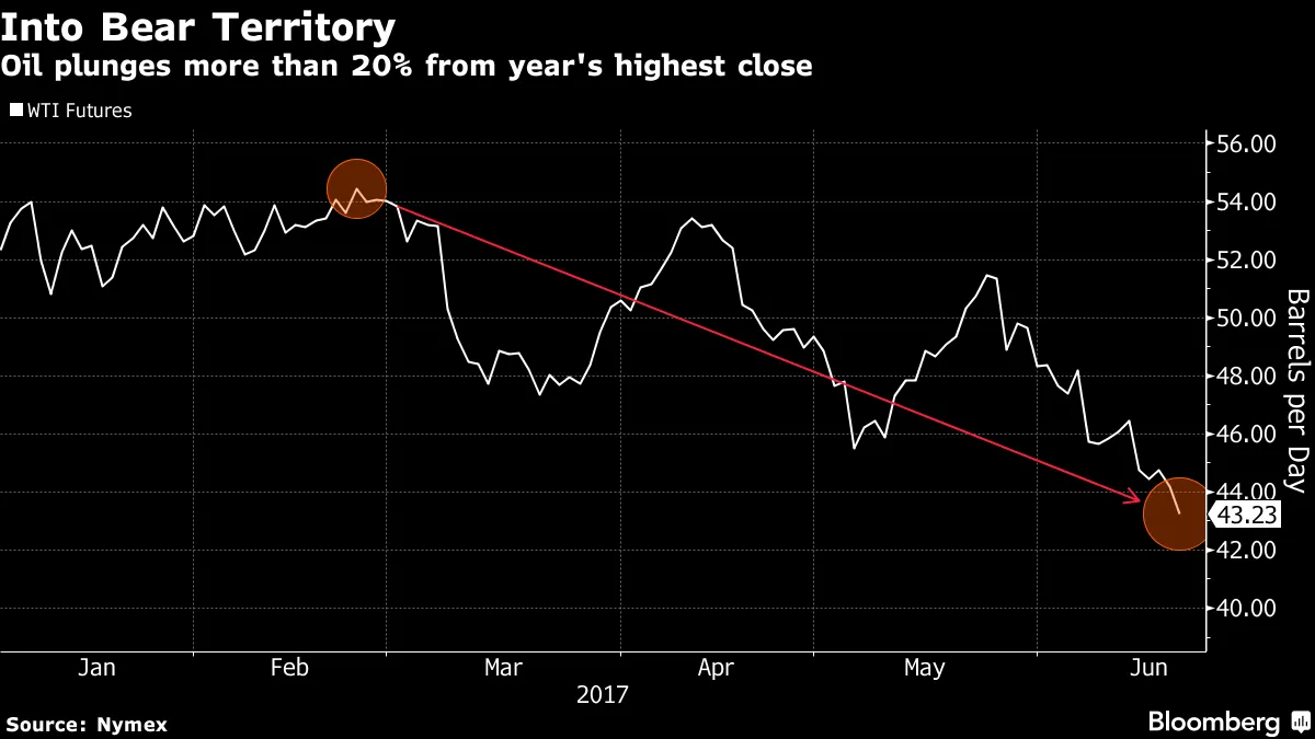 石油市场正在崩溃,影响深远。原油进入自八月以来的第一个熊市,因全球供应过剩的担忧加剧。西德克萨斯中质油,作为美国基准,较今年最高收盘价下跌超过20%,期货在纽约以每桶43.23美元结算。这比2月23日的54.45美元下降了。